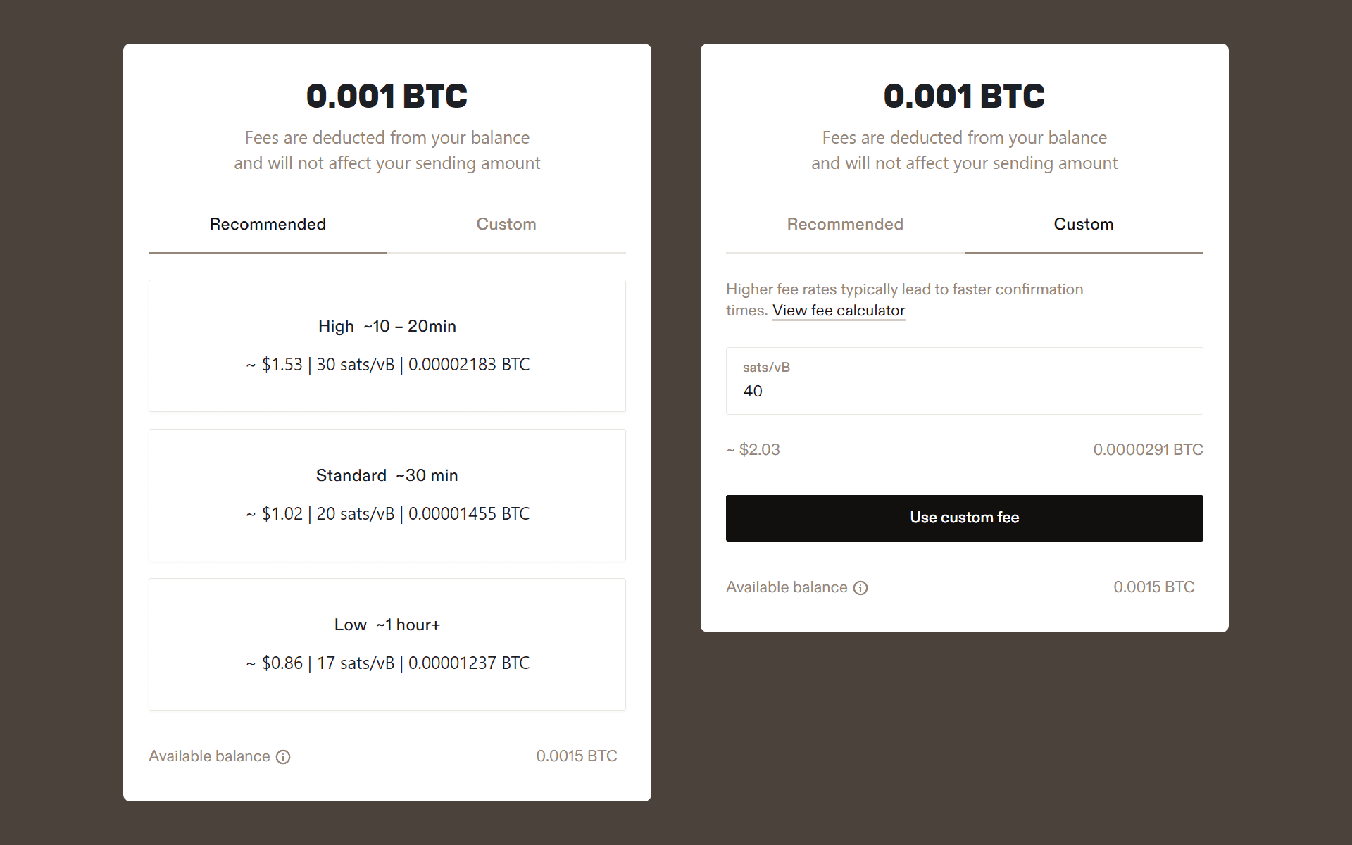 - Select whether you’d the “Low,” “Standard,” or “High” fee option for your transaction (or click on the “Custom” tab to enter another amount)
