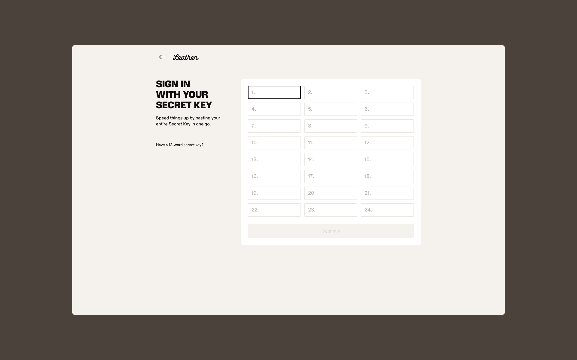 Enter the seed phrase you copied from your Sparrow Wallet into the Secret Key input form.