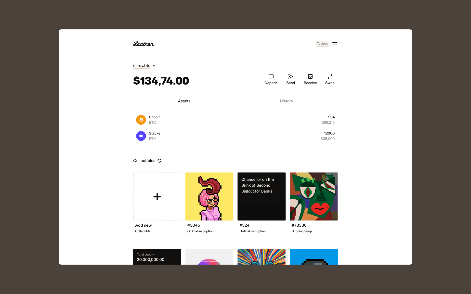 Your Ordinals will be displayed in the “Collectibles” section of your Leather home page.