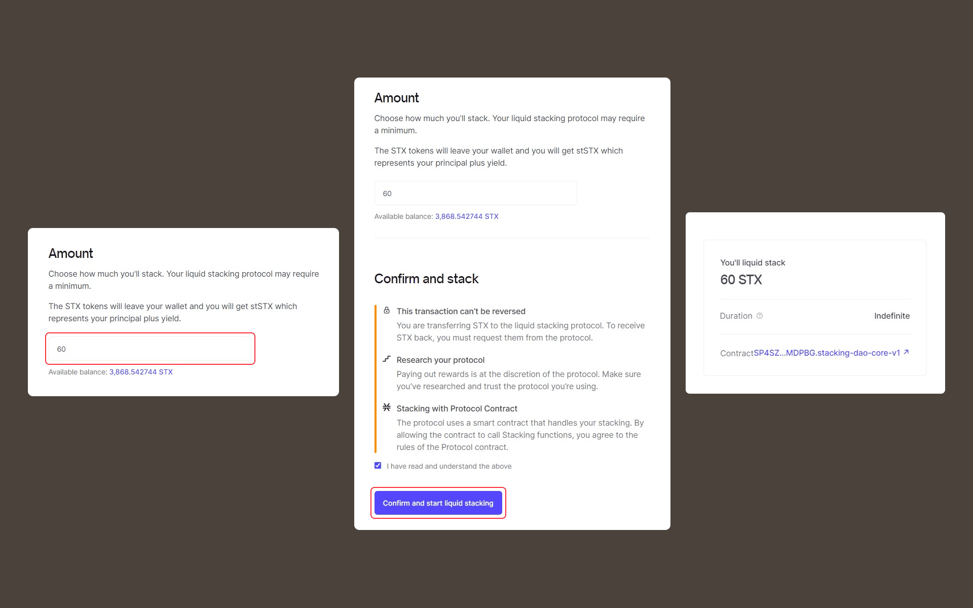 Liquid Stacking, a new feature developed by independent third parties such as Stacking DAO and LISA, gives users the ability to lock their STX in exchange for a tokenized representation of Stacked Stacks. According to the developers of the Liquid Stacking feature, this allows users to employ their Stacked STX throughout the ecosystem while continuing to earn Stacking rewards. Unlike Stacking, there is no minimum STX required to participate in Liquid Stacking. Users can also trade back to STX at any time.