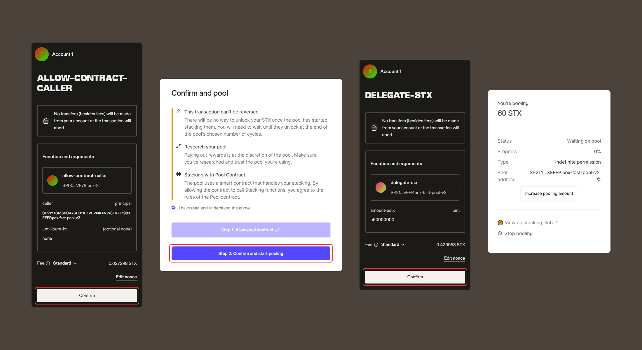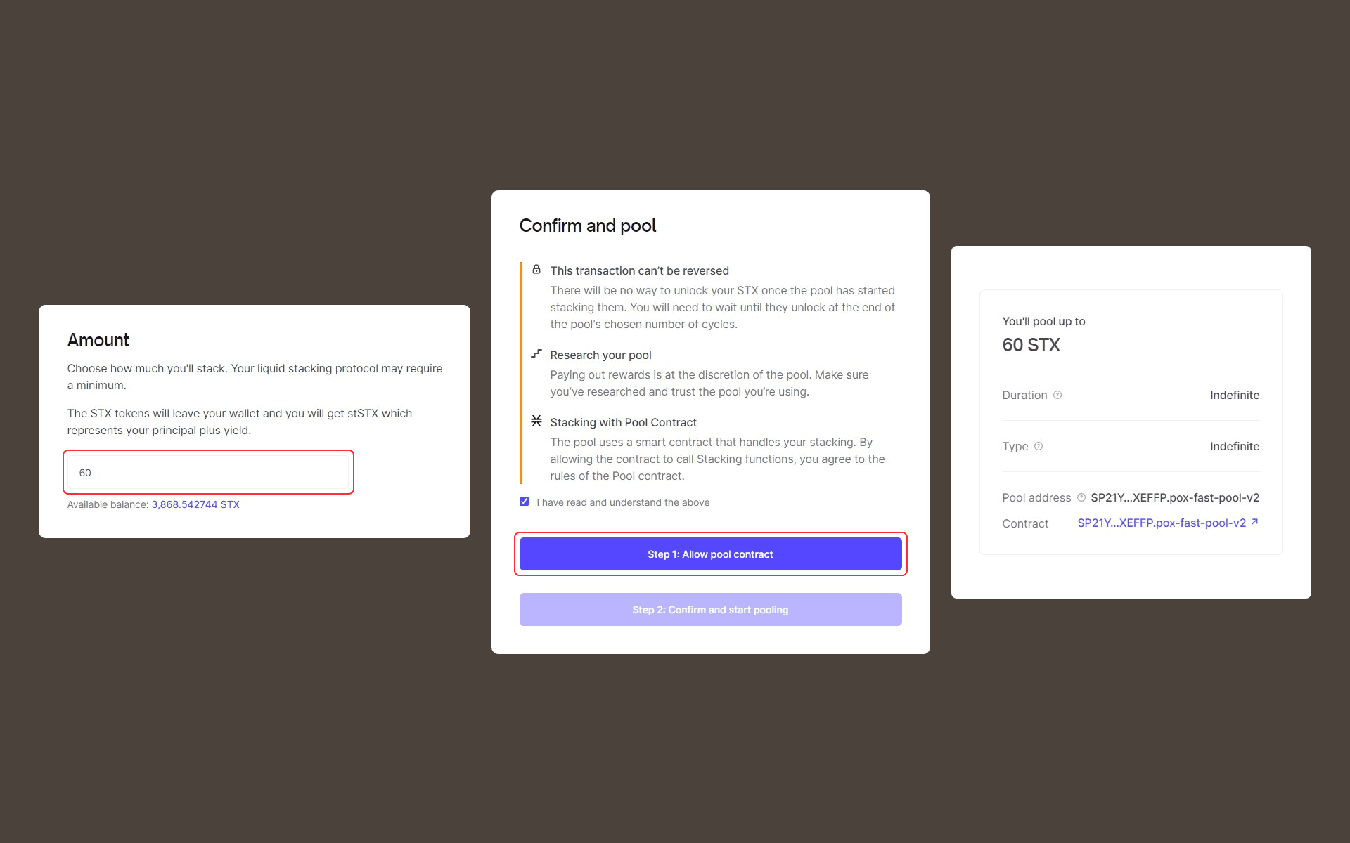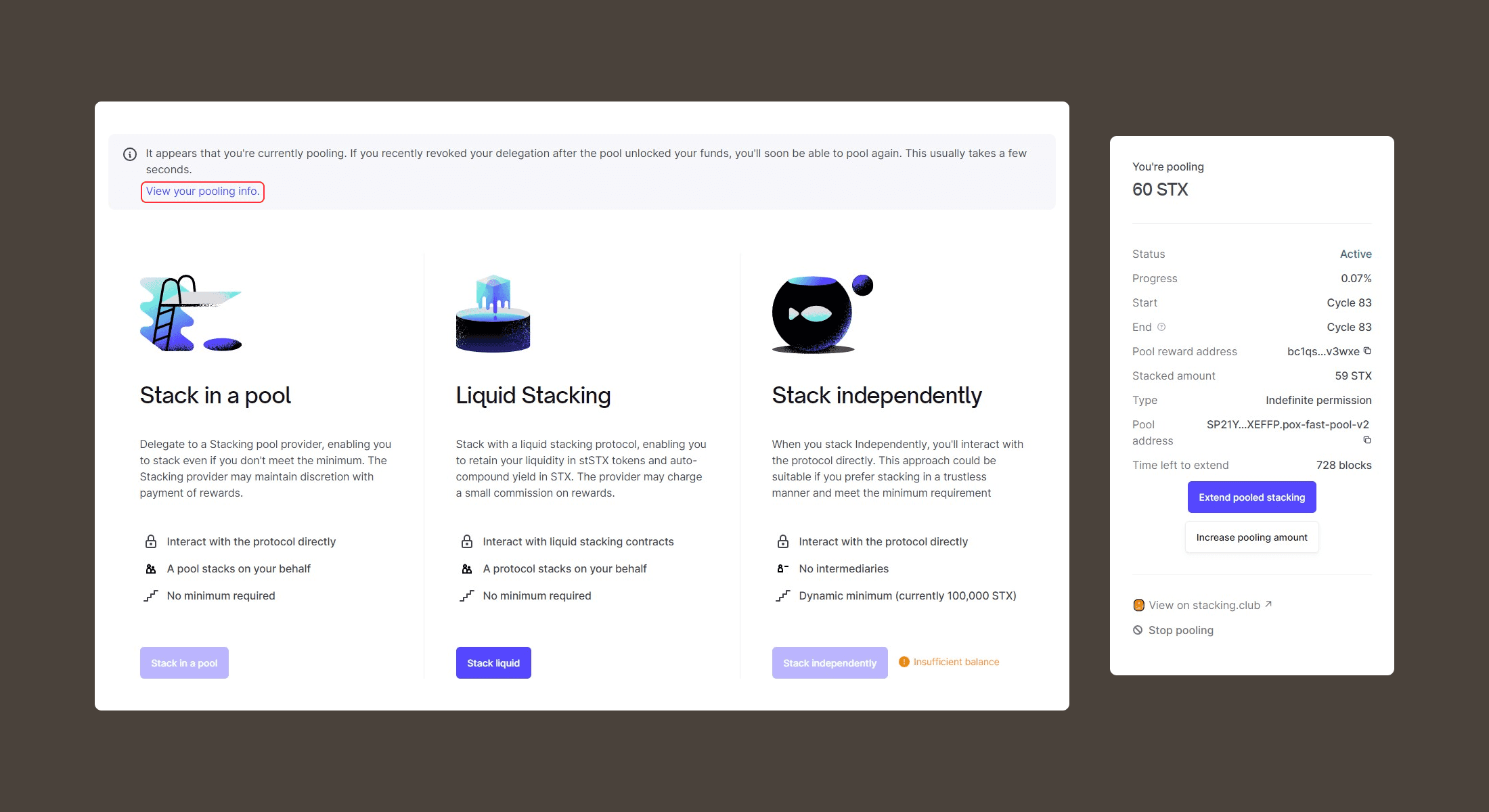 Leather does not operate or manage any Stacking pools or liquid Stacking protocols. Users are responsible for evaluating the risks, terms, and smart contracts involved in any third-party options they access through Leather.