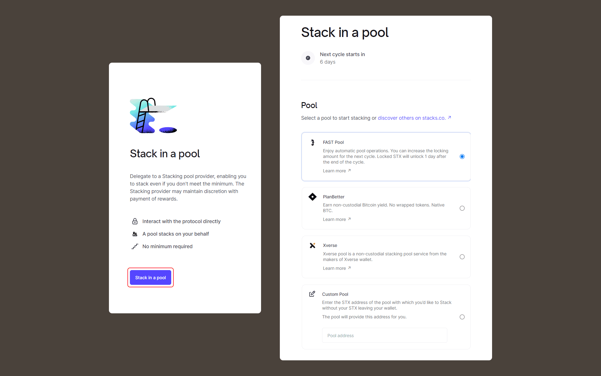 A pool is a third-party service that oversees the node operations for Stacking, and the pool service pays out rewards after every Stacking cycle. Pools are non-custodial and each pool has its own minimum STX requirement to participate.
