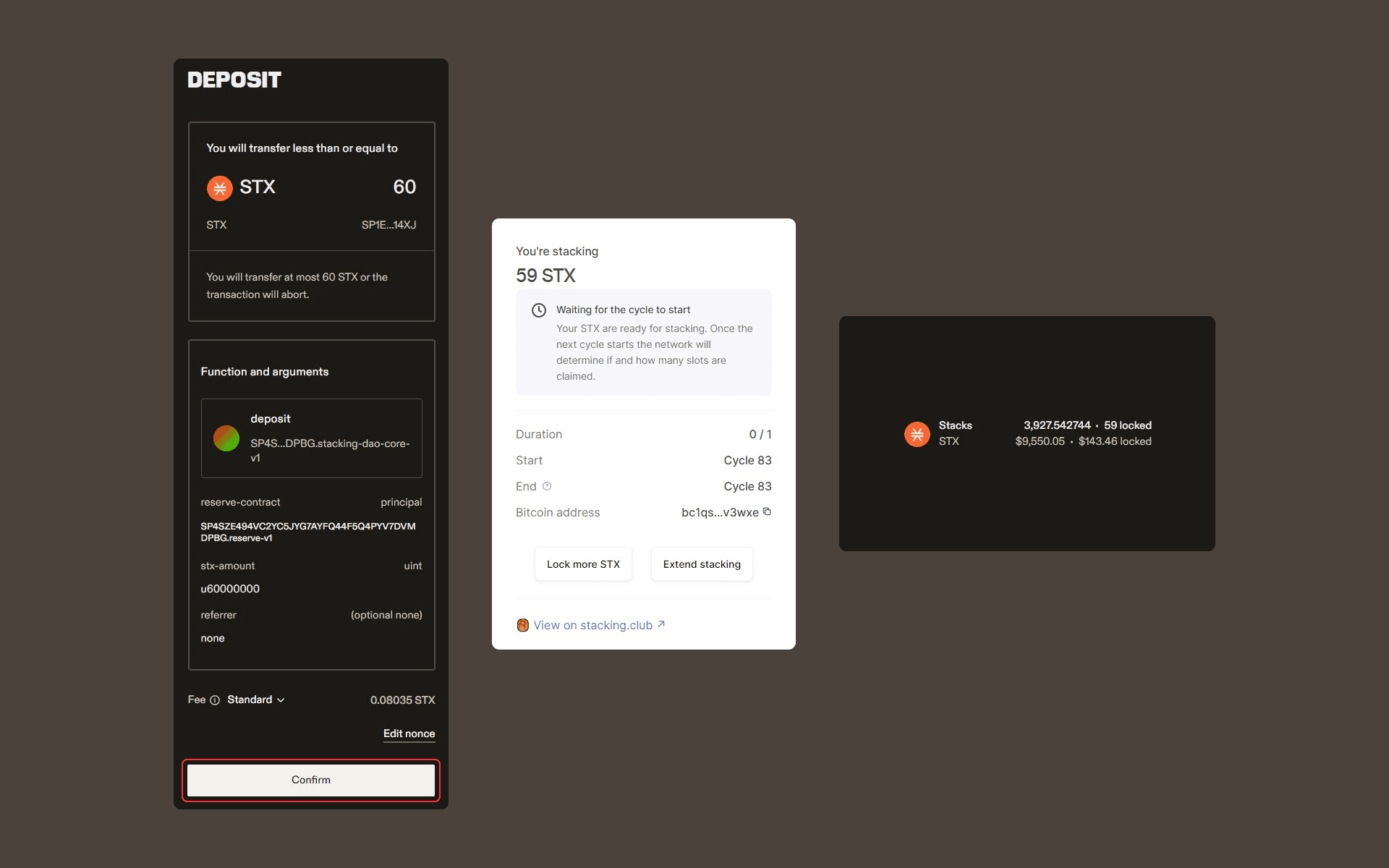 A status page will appear that tracks your Liquid Stacking process, and stSTX or LiSTX will appear in your wallet
