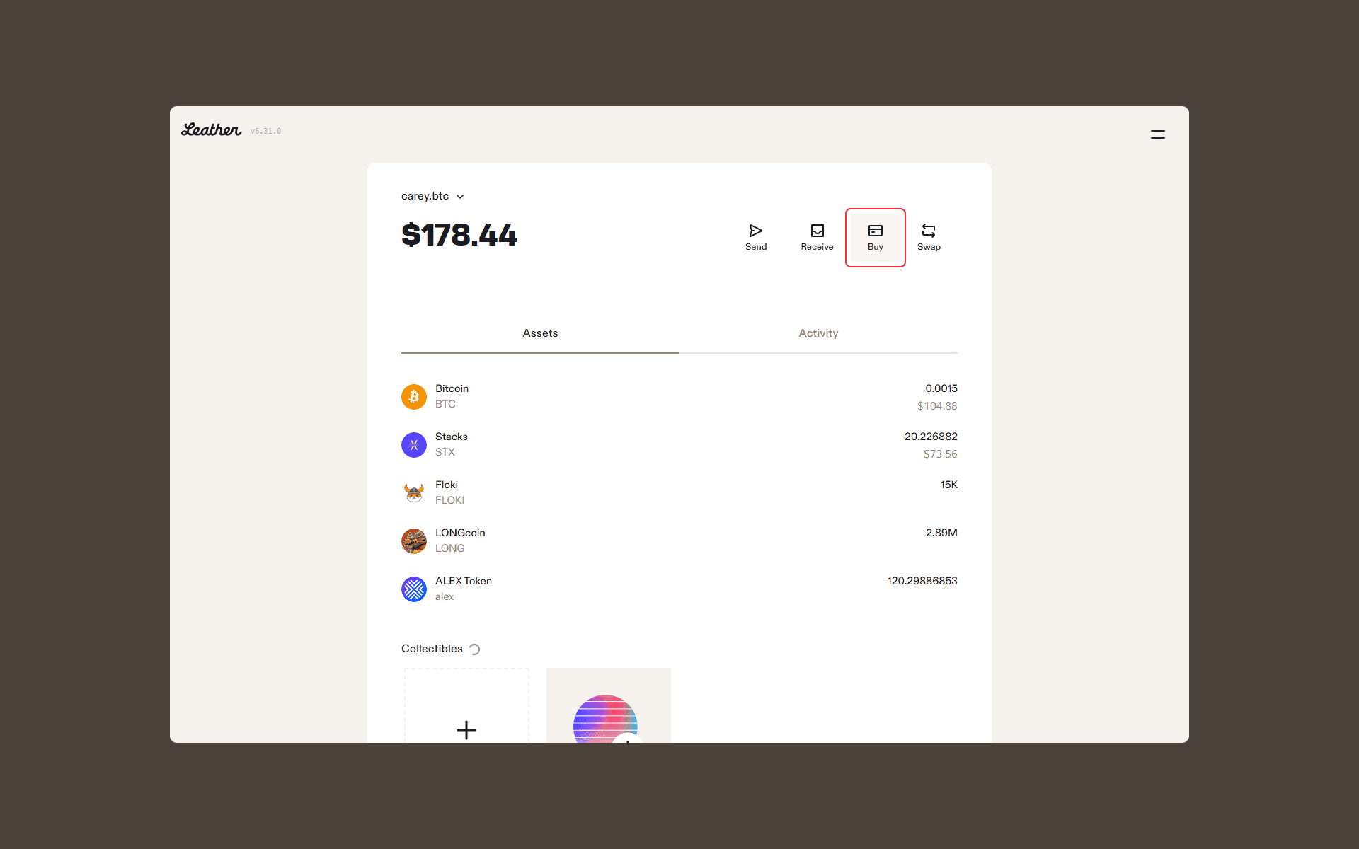 Once you’ve followed the steps to connect your Leather wallet to the DEX or P2P platform, you’ll be able to acquire bitcoin, which should show up in your wallet upon completing the transaction.