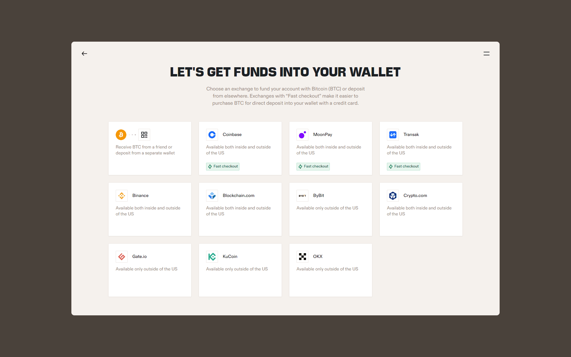 Select “Bitcoin,” and you’ll be taken to a screen where you can pick the exchange or platform that you want to buy bitcoin from. The options labeled “Fast Checkout” are the ones that let you use your credit or debit card to purchase tokens.