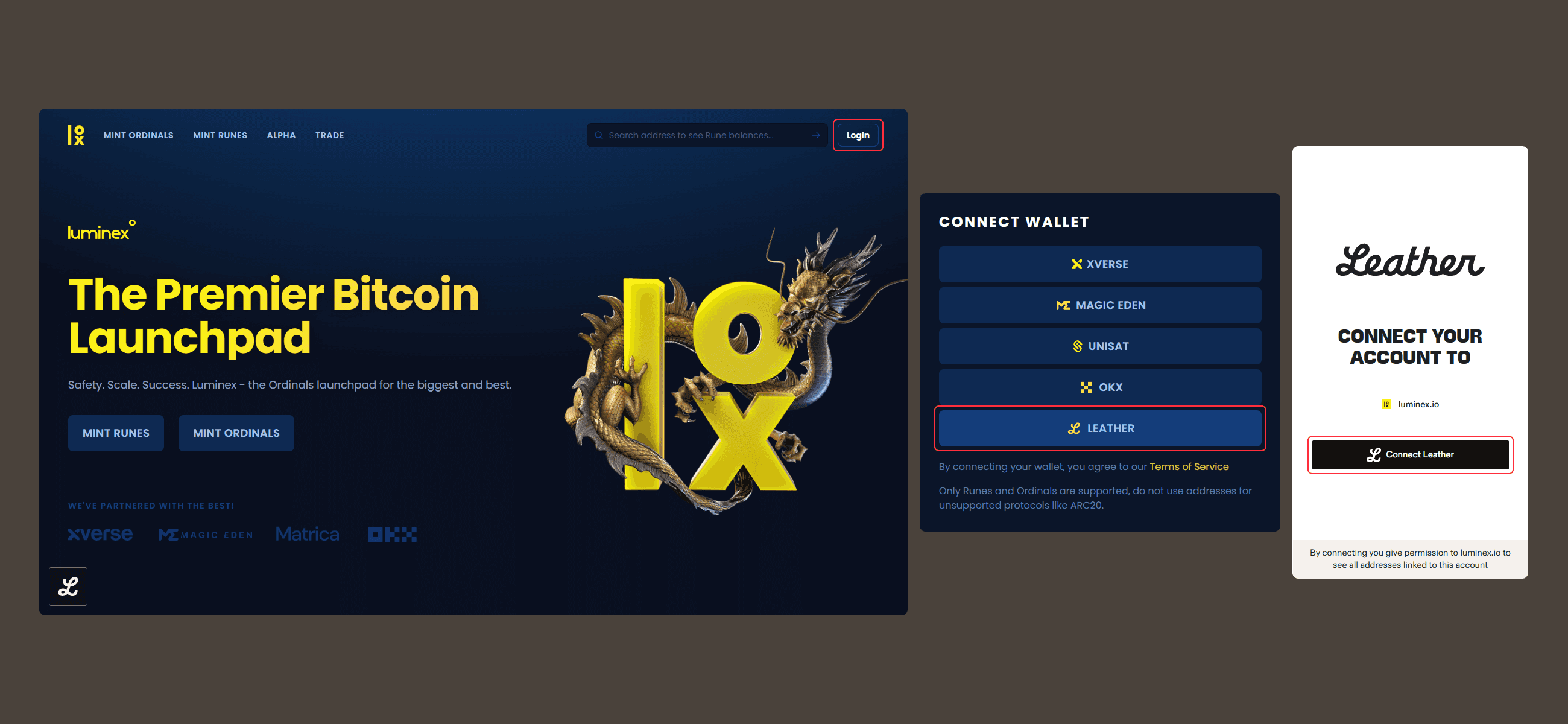 Luminex is an Ordinals launchpad that gives users the ability to mint inscriptions and Runes. It also gives Leather Bitcoin wallet users snapshots of the Runes market for them to determine which Runes tokens they might want to mint, and access to Runes trading on Magic Eden.