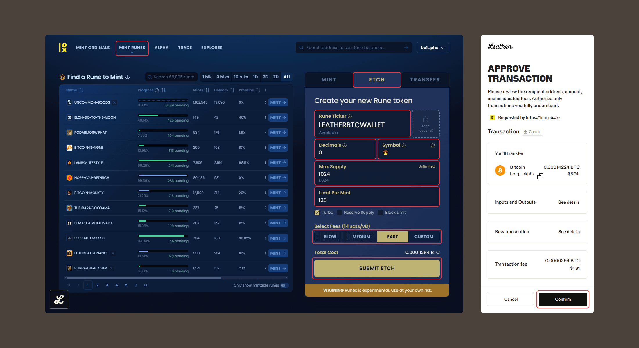 Users who want to create their own Runes tokens will need to etch a Rune. To etch a Rune in Luminex: