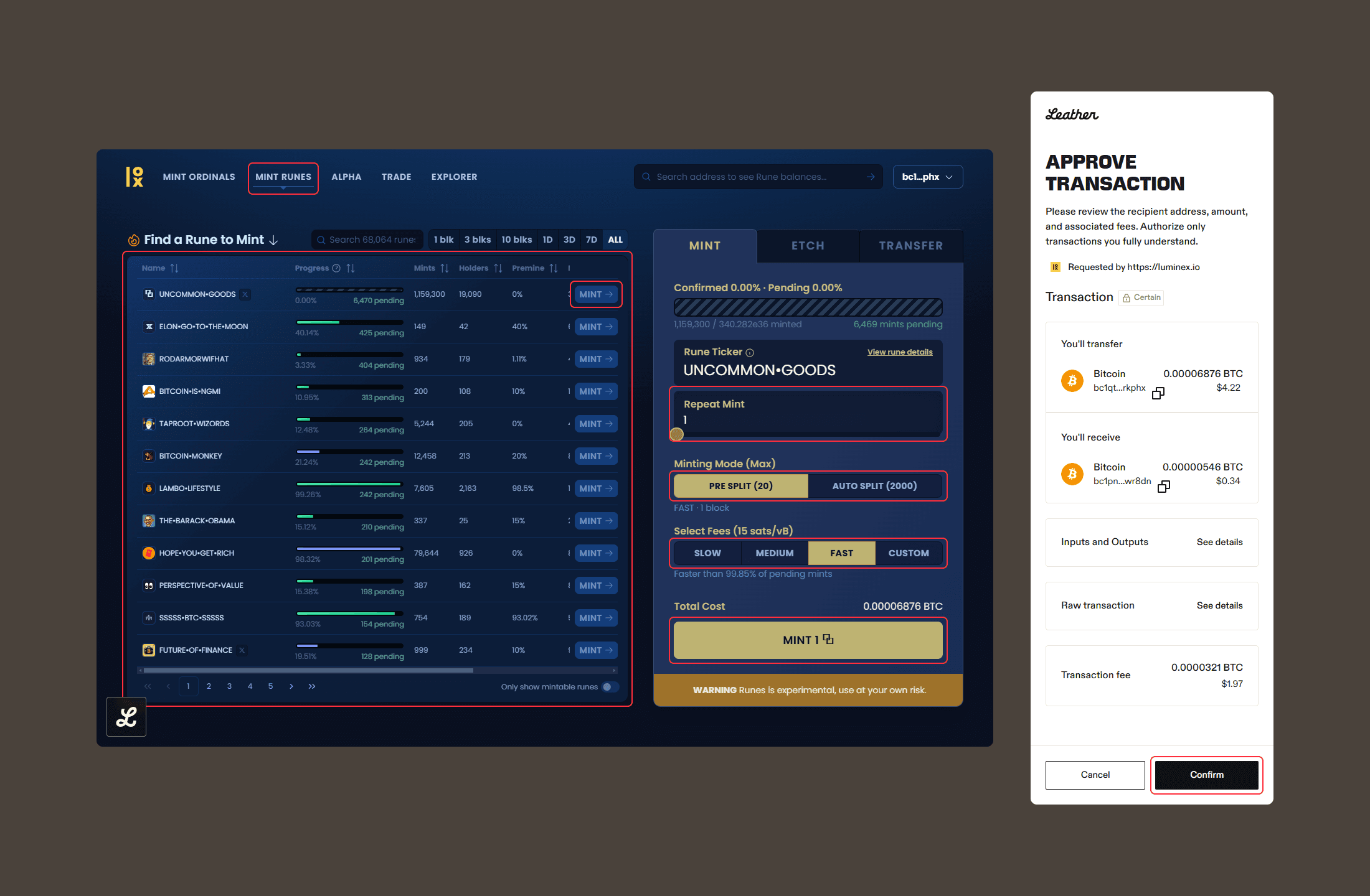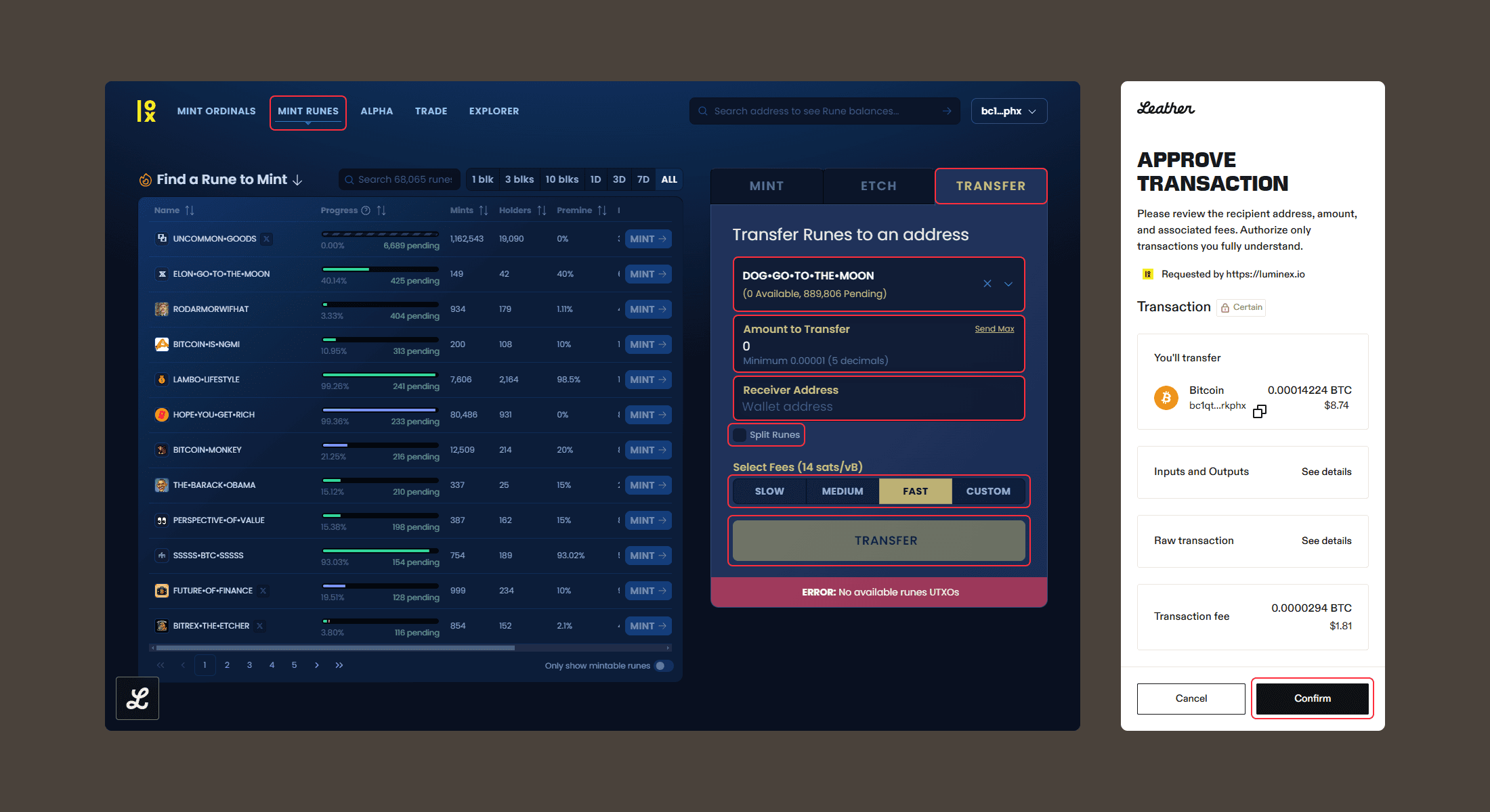 - Click “Mint Runes,” which will take you to the Luminex Runes dashboard