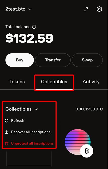 This can be helpful when you have inscriptions in your wallet that you do care about. Then you can selectively select which inscriptions you want to unprotect. Click the collectables tab in your Leather extension Scroll to the collectable you want to unprotect Hover over it with your mouse Click the top right corner menu And then click “Unprotect”